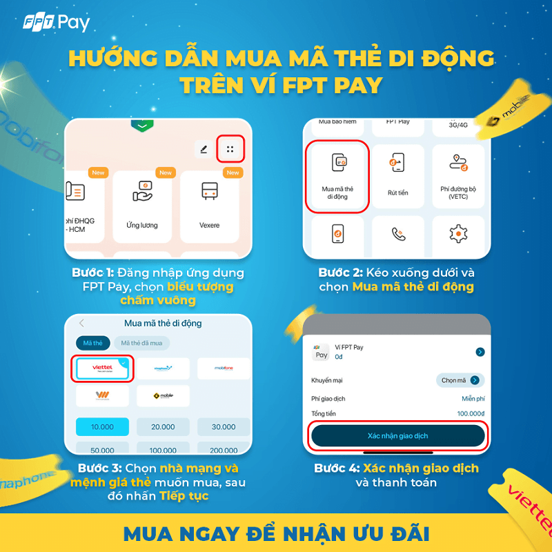 Để mua mã thẻ điện thoại di động trên ứng dụng FPT Pay, Khách hàng thực hiện theo hướng dẫn dưới đây: